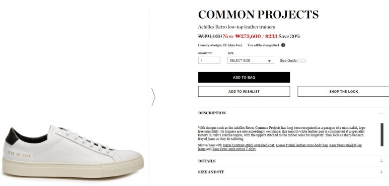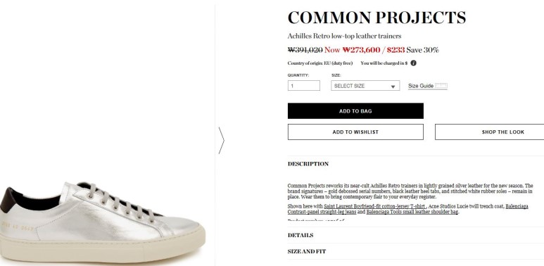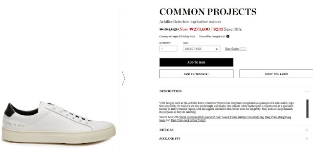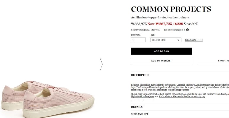 한국 직배송비 30불 추가에 커먼프로젝트는 원산지가 이탈리아여서 부가세 10%만 내면 됩니다. 보통 매치스에서 원산지 증명은 알아서 해주고 있습니다.